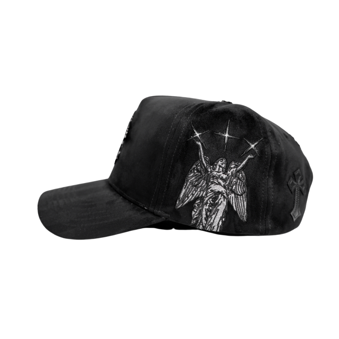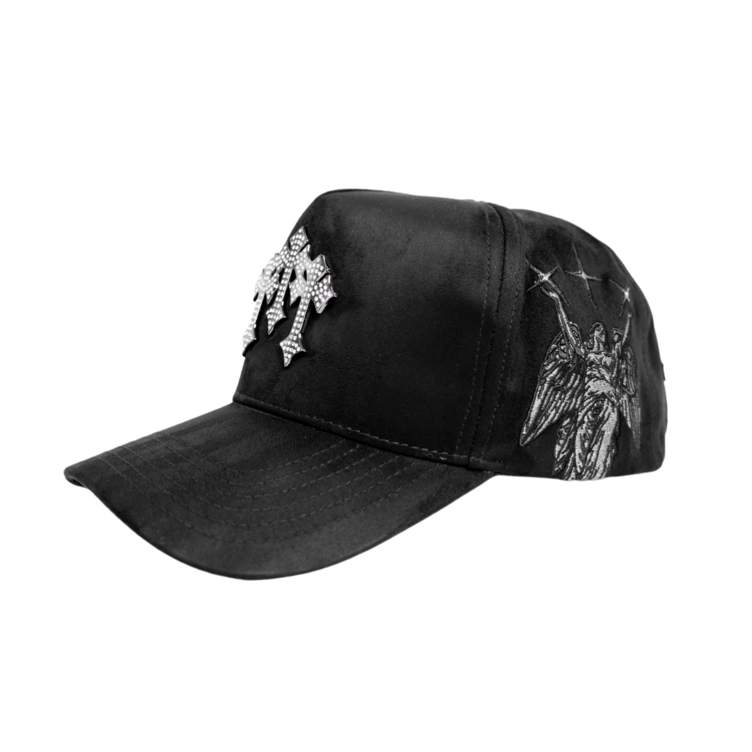 Our new CHROME CROSS TOTAL BLACK hat is now in stock, made from premium suede fabric and featuring a metal rhinestone pin on the front, as well as leather cross patches on the sides. The angel logo is embroidered in 2D for added detail.